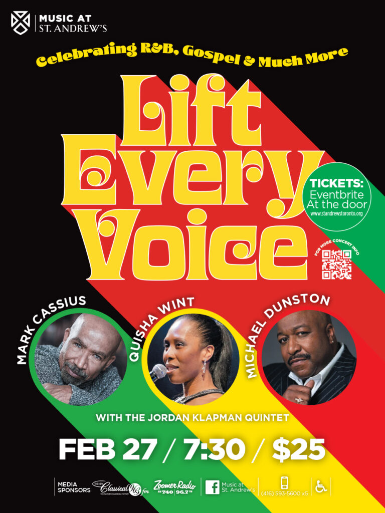 Back by popular demand, LIFT EVERY VOICE is the inspiring and inviting tribute to Black History Month, presented by Music at St. Andrew’s. Singers Mark Cassius and Michael Dunston, with M.C. Quisha Wint all return this year, along with the Jordan Klapman Quintet. This 90-minute concert will honour and celebrate Black history with fabulous fare from the musical worlds of Gospel, Soul, Jazz, R & B, Reggae and Pop. Don’t miss favourite classics like “Lean On Me,” “Don’t Get Around Much Anymore,” “Respect Yourself,” and many more.
