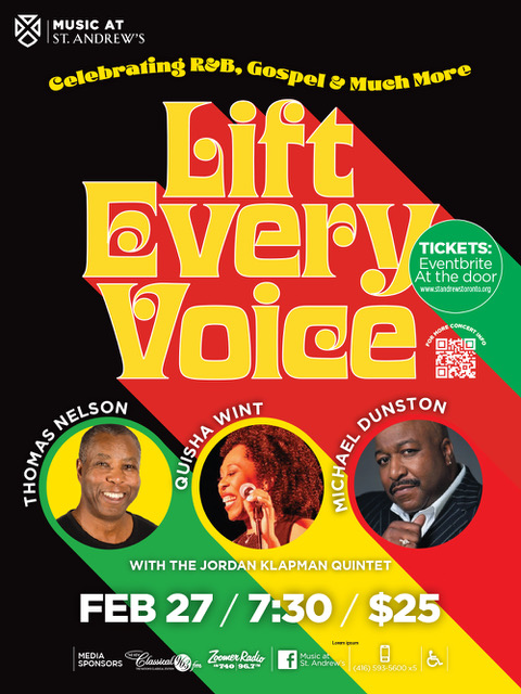 Back by popular demand, LIFT EVERY VOICE is the inspiring and inviting tribute to Black History Month, presented by Music at St. Andrew’s. Singers Thomas Nelson and Michael Dunston, with M.C. Quisha Wint, will perform, along with the Jordan Klapman Quintet. This 90-minute concert will honour and celebrate Black history with fabulous fare from the musical worlds of Gospel, Soul, Jazz, R & B, Reggae and Pop. Don’t miss favourite classics like “Lean On Me,” “Don’t Get Around Much Anymore,” “Respect Yourself,” and many more.